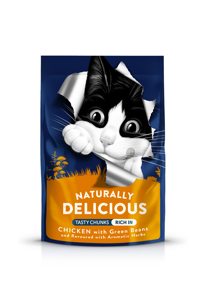 Felix Naturally Delicious with Chicken & Green Beans, flavoured with aromatic herbs, are perfectly steam cooked chunks in a tasty jelly.