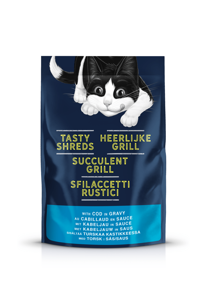 Felix Tasty Shreds with Cod are tender and irresistible shredded pieces in a tasty gravy your cat will love!
